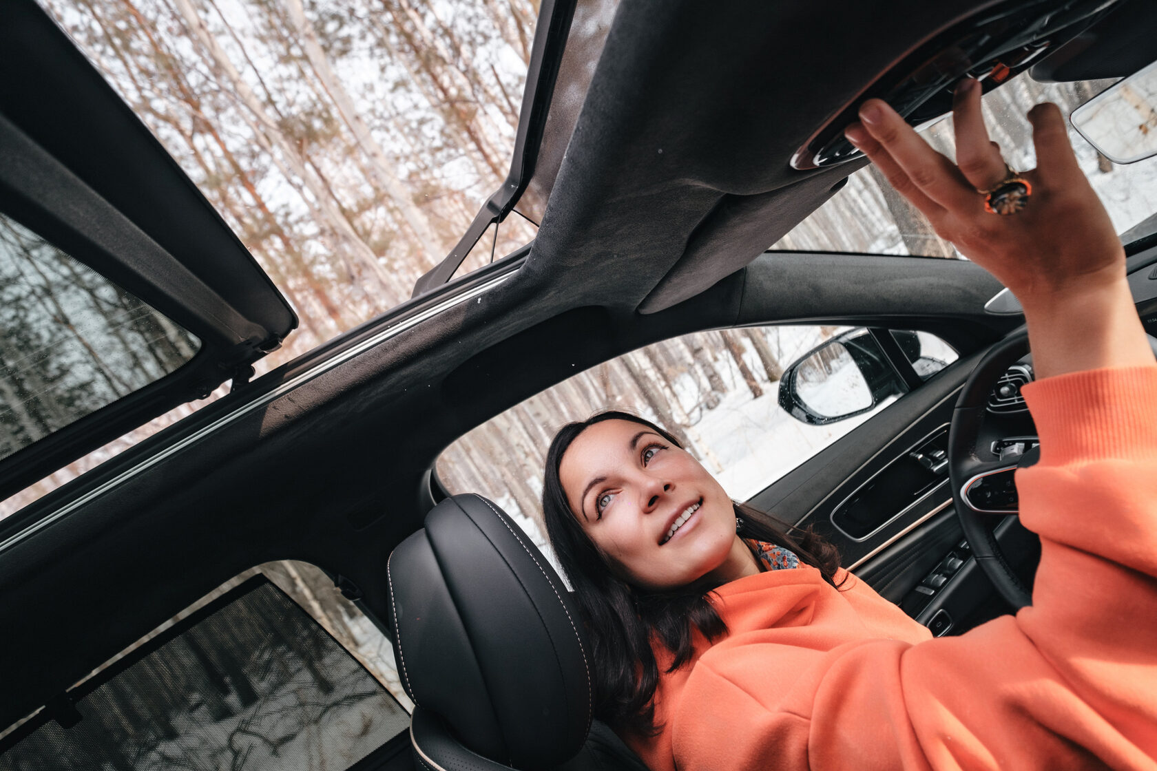 На руль выведена система управления, в том числе голосовой помощник. Можно попросить его открыть окно или багажник, отрегулировать температуру в салоне, включить музыку и т.д. «Открой, пожалуйста, панорамную крышу», – обратилась я к невидимому помощнику. В ту же секунду стеклянная крыша поползла в сторону и в салон начали падать хлопья снега…