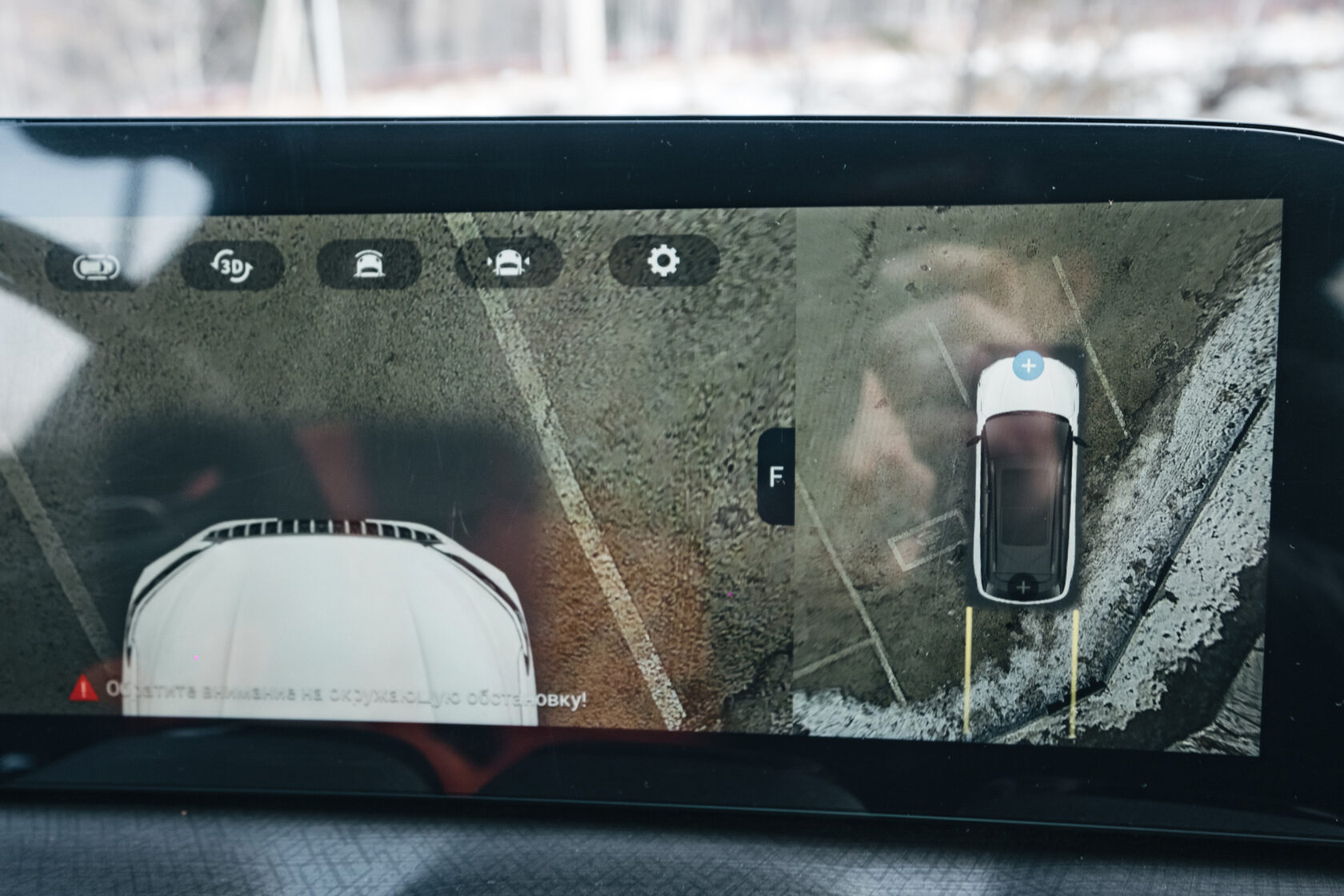 Как только мы тронулись с места, на широкой приборной панели автоматически включилась камера кругового обзора. И тут началась магия: Кирилл показал, как можно настроить прозрачные шасси, и в ту же секунду машина исчезла с камер – остались лишь колеса.